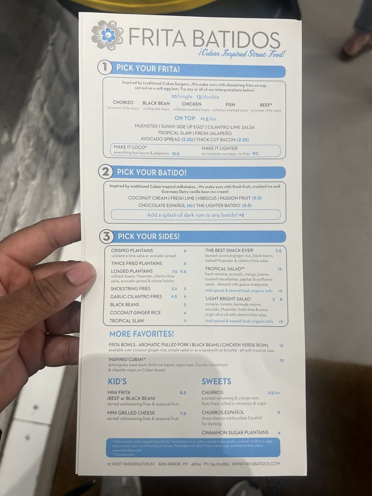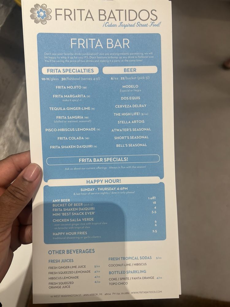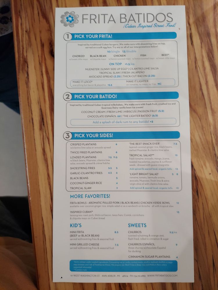 Frita Batidos is a Cuban-inspired restaurant known for its delicious burgers, flavorful cocktails, and vibrant ambiance. Located in Ann Arbor, MI, this women-owned establishment offers a range of options for pescatarians, vegans, and vegetarians. With a menu full of mouth-watering dishes like the Beef Frita, Inspired Cuban, and Passion Fruit Batidos, customers rave about the fresh, tasty food and friendly service. The casual yet bustling atmosphere combined with outdoor seating options makes it a popular choice for groups, families, and casual diners alike. Experience the unique flavors and relaxed vibe of Frita Batidos while enjoying its gender-neutral restrooms, free Wi-Fi, and happy hour specials. Don't miss out on this gem for a truly memorable dining experience.